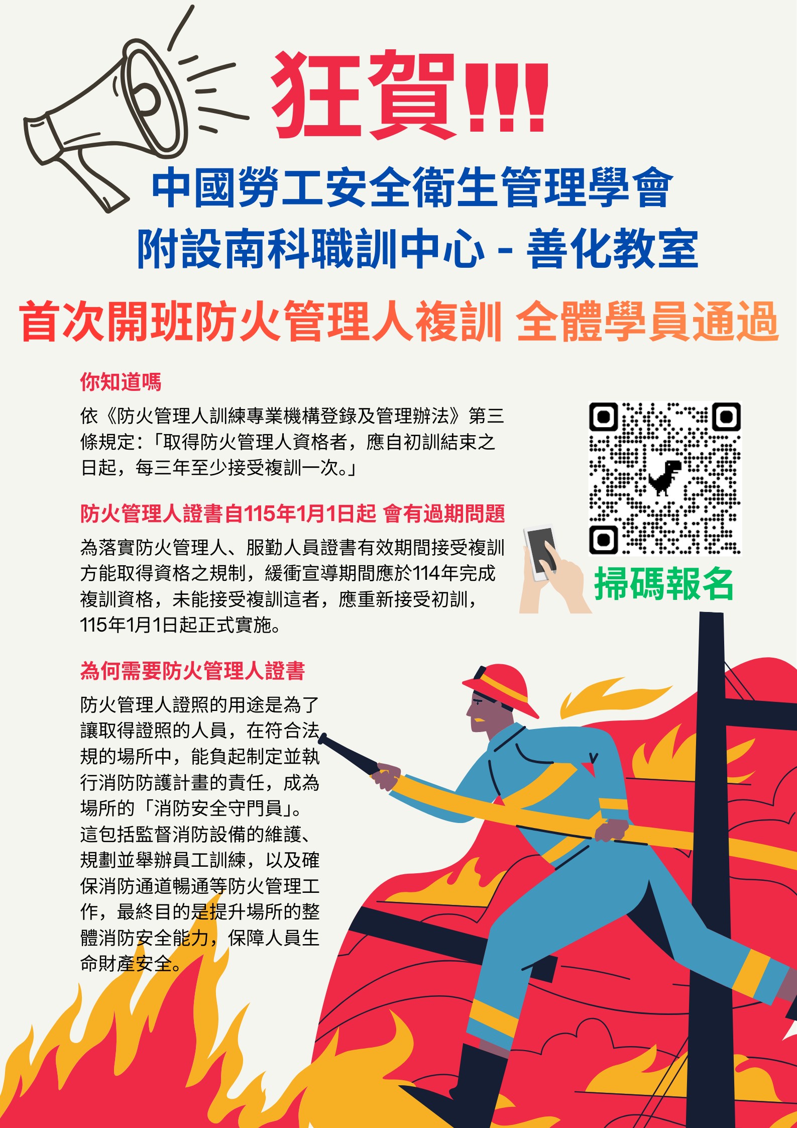 自115年1月1日起,防火管理人、服勤人員、保安監督人、保安檢查員、液化石油氣零售業安全技術人員及爆竹煙火監督人證書過期應重新接受初訓【防火複訓熱烈招生中!點我查看開課日期】