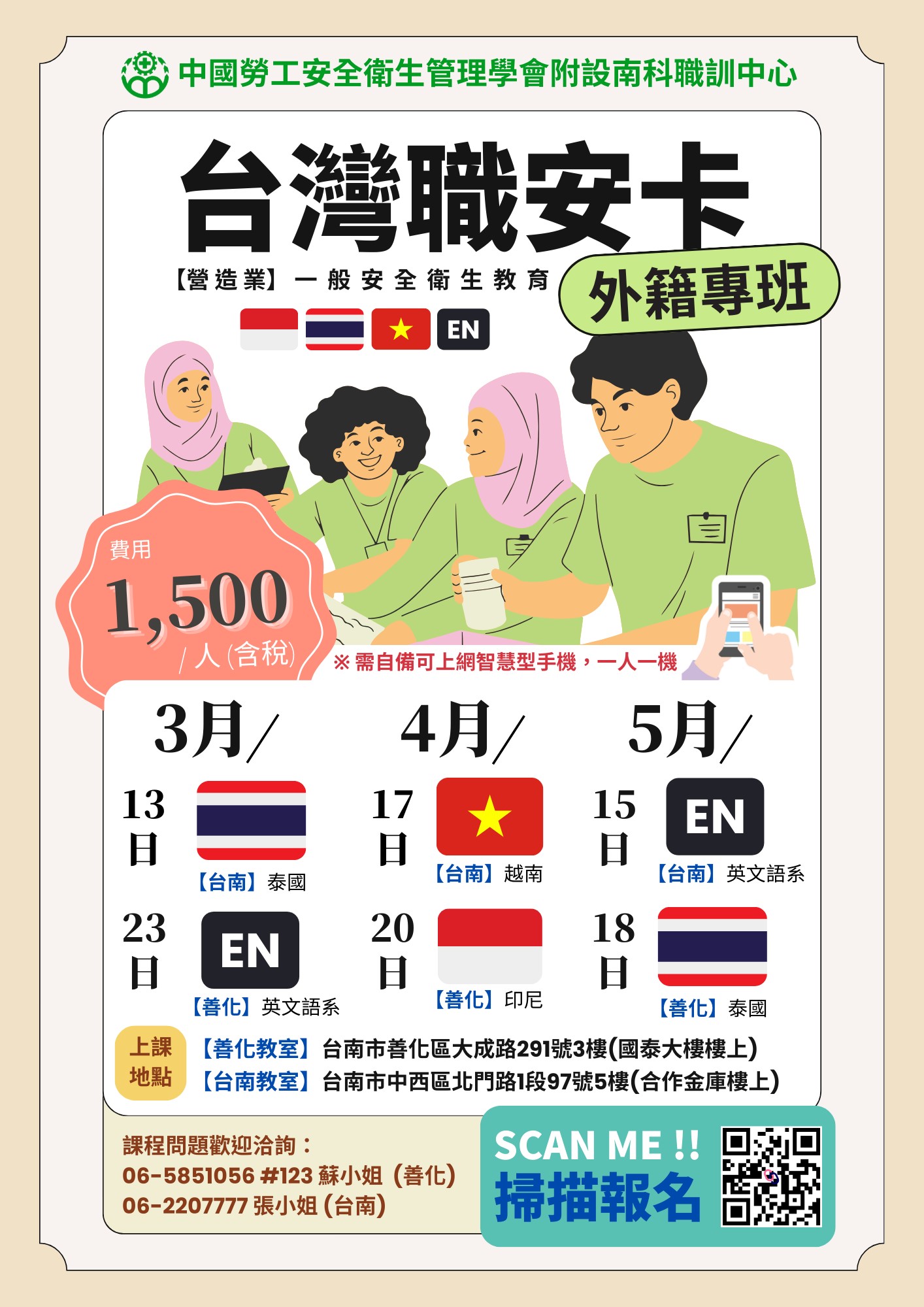 【外籍專班】台灣職安卡-善化教室/台南教室【初訓6小時 / 營造業】115年3月~5月開課日期&線上報名 ***點我查看***