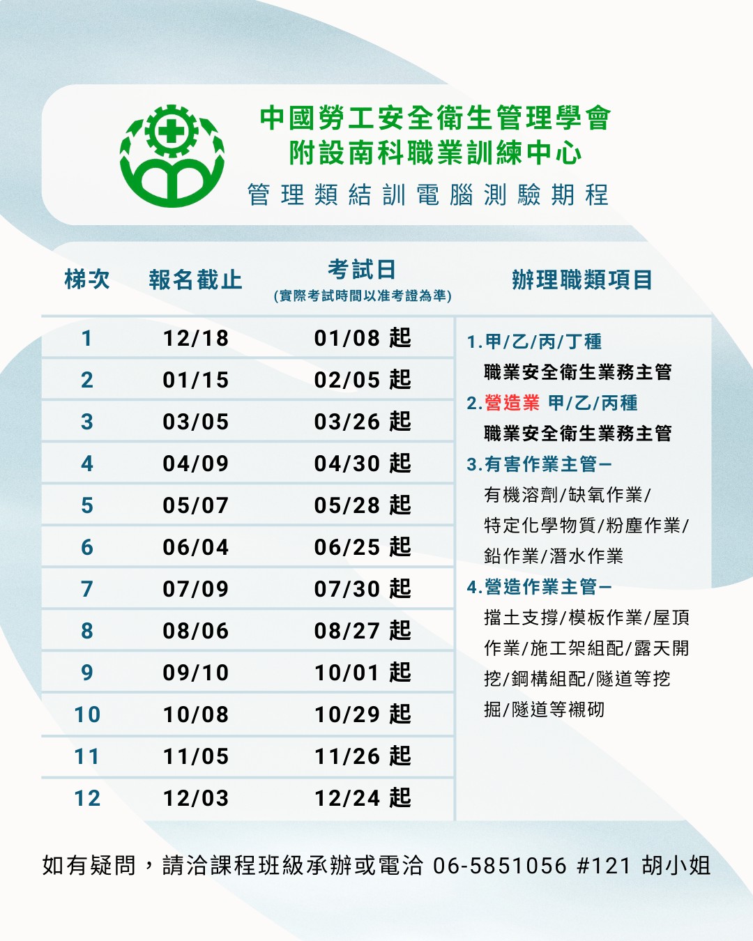 🖥️🗒️ 管理類結訓電腦測驗南科職訓中心台南教室試場期程 & 115年度全國技術士技能檢定梯次 請參考下圖。
