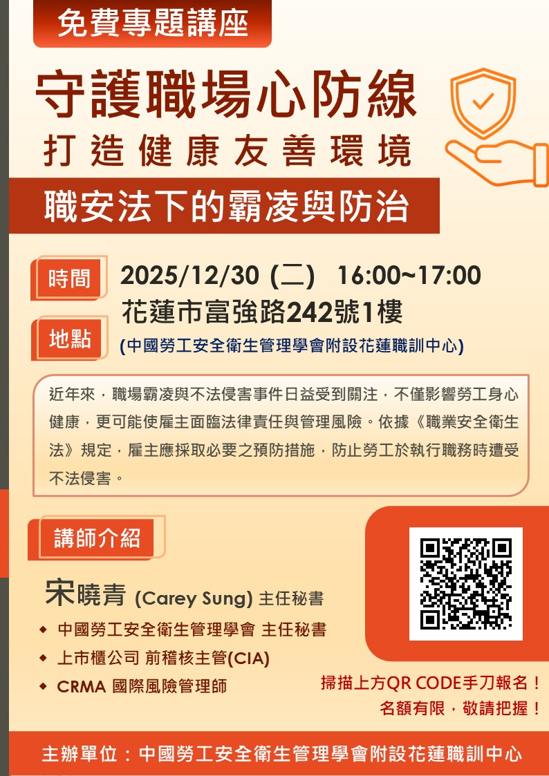 114年12月30日(二)於花蓮職訓中心辦理「免費專題講座-守護職場心防線打造健康友善環境」
